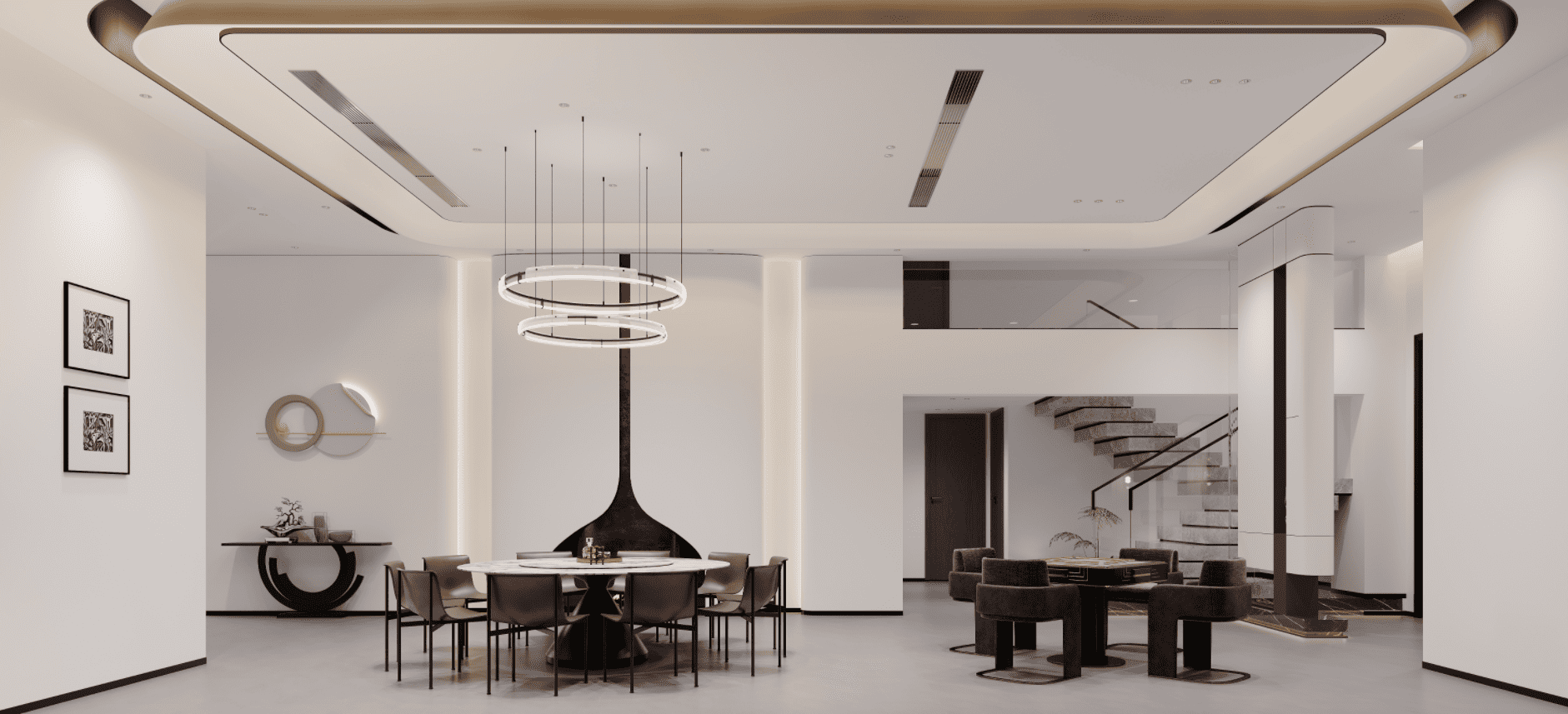 色彩上以中性大地色系为基调——米白、浅灰、燕麦色、深咖等,营造宁静氛围;局部通过艺术品、家具或绿植点缀墨绿、陶土红或靛蓝,增添层次与生命力。整体风格可根据业主偏好选择新中式、现代简约、地中海或侘寂风,但核心在于“统一中有变化,克制中见精致”。