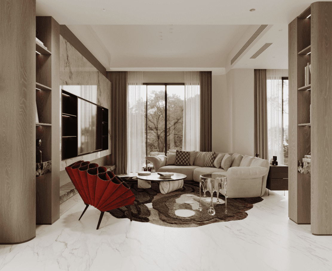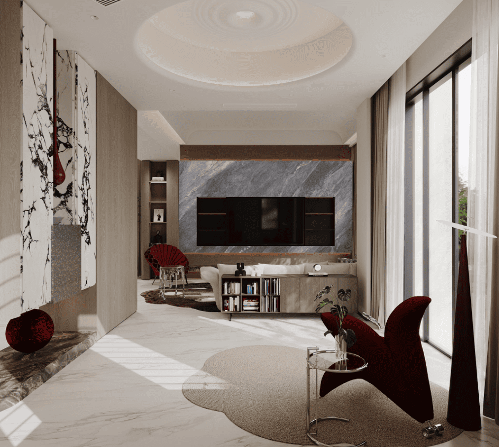 高端别墅摒弃繁复装饰,崇尚“少即是多”的现代美学。外立面常采用天然石材、耐候钢板、木格栅或清水混凝土,搭配金属线条勾勒轮廓,形成稳重而不失现代感的视觉语言。室内则大量运用原木、微水泥、天然织物、手工陶砖等温润材质,触感柔和,肌理丰富。色彩上以中性大地色系为基调——米白、浅灰、燕麦色、深咖等,营造宁静氛围;局部通过艺术品、家具或绿植点缀墨绿、陶土红或靛蓝,增添层次与生命力。整体风格可根据业主偏好选择新中式、现代简约、地中海或侘寂风,但核心在于“统一中有变化,克制中见精致”。