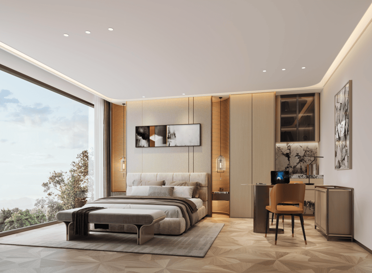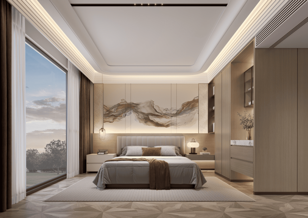 观澜湖九里别墅的设计风格定位于“新东方湖居风”——以东方美学为底蕴,以现代生活为骨架,以湖景资源为灵魂。整体摒弃繁复装饰,强调“简、静、润、雅”的空间气质。色彩灵感源自湖光山色:晨雾灰、水波蓝、芦苇金、青瓷绿与原木暖调交织,营造出如水墨氤氲般的柔和层次。材质上注重天然肌理与触感温度,奢华不靠炫目堆砌,而源于对细节、比例与光影的极致把控。