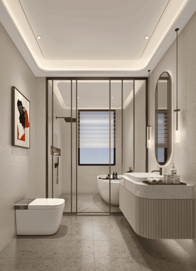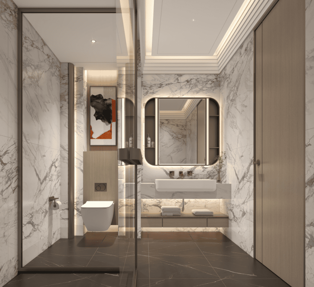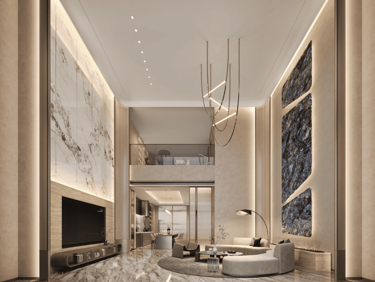 厨房集成德国高端厨电(如Miele、Gaggenau),橱柜采用F4星环保板材配智能收纳系统;主卫以天然大理石与岩板结合,搭配智能镜柜、恒温淋浴、蒸汽房及地暖,打造五星级沐浴体验。全屋配置五恒系统(恒温、恒湿、恒氧、恒静、恒洁)与新风净水系统,确保全年健康舒适。