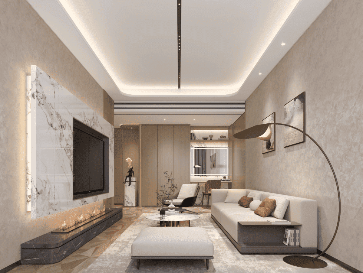 材质选择紧扣“湖居”主题。地面通铺人字拼橡木地板或哑光仿古岩板,温润防滑;墙面采用微水泥、天然木饰面、艺术涂料或手工编织藤饰面,局部点缀青砖、玉石或宣纸玻璃,传递手作温度与文化厚度。天花以悬浮式线性设计为主,嵌入磁吸轨道灯与隐藏灯槽,配合无主灯系统,营造“见光不见灯”的柔和氛围。