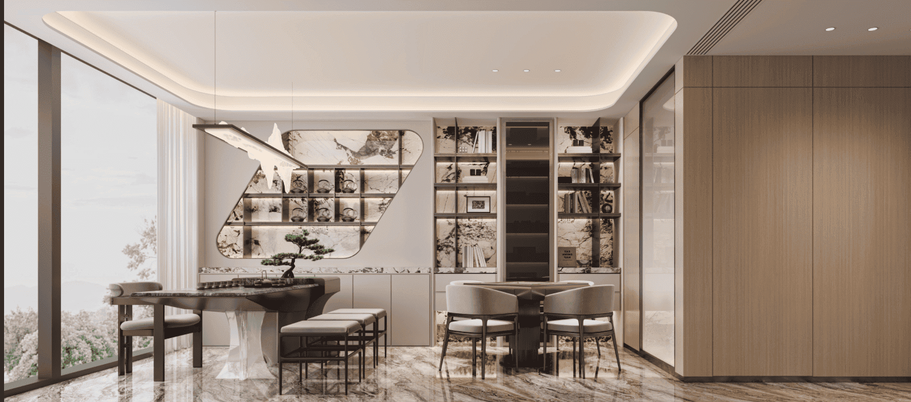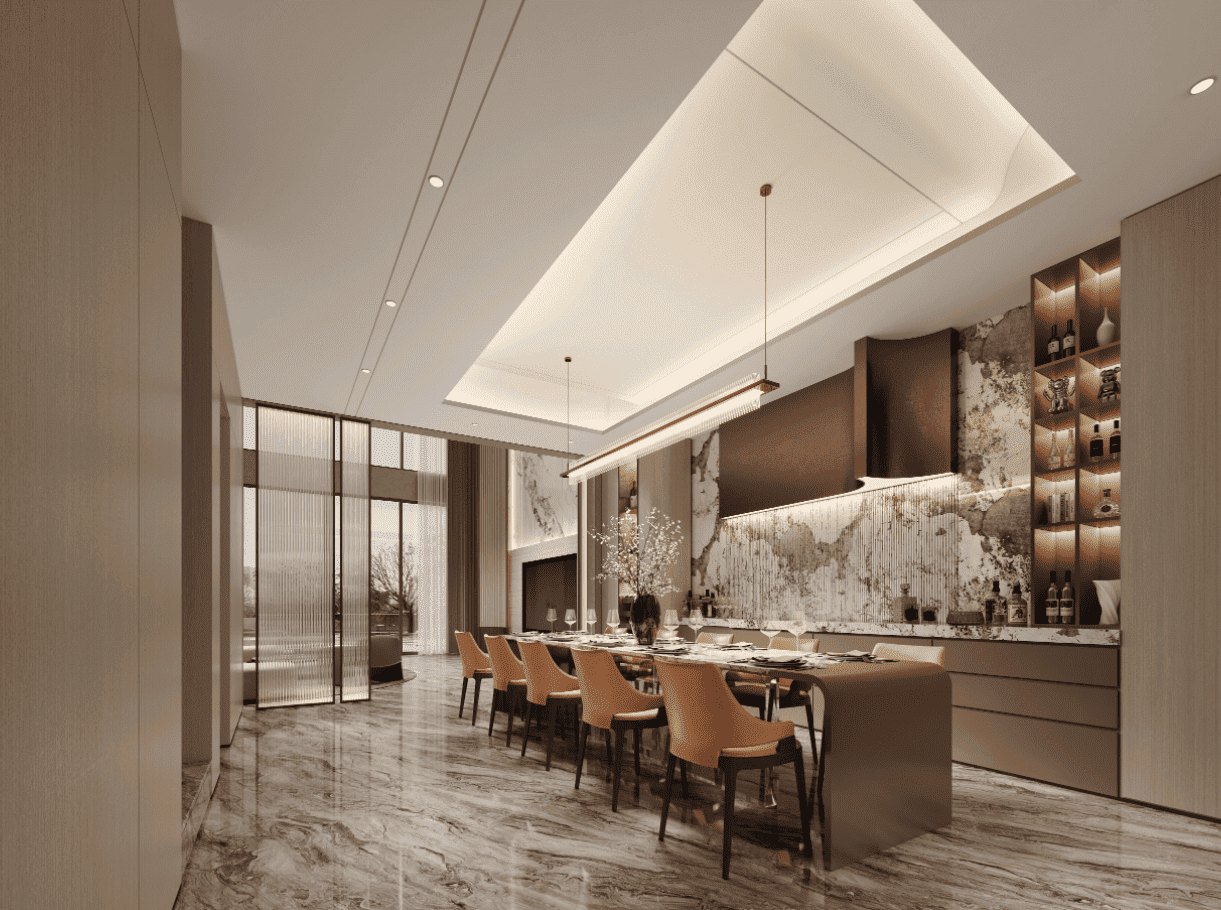 设计的核心在于“打通边界”。通过超大落地窗、全景折叠门、悬挑露台与室内庭院,将湖面倒影、四季林色、晨昏天光引入室内,实现“人在屋中坐,景自窗外流”的沉浸式体验。一层公区采用开放式LDK(客厅-餐厅-厨房)布局,动线流畅,视野通透。客厅临湖而设,沙发区朝向湖面,形成天然“观景席”;西厨岛台兼具社交、备餐与早餐功能,中厨则独立封闭,满足中式烹饪需求。