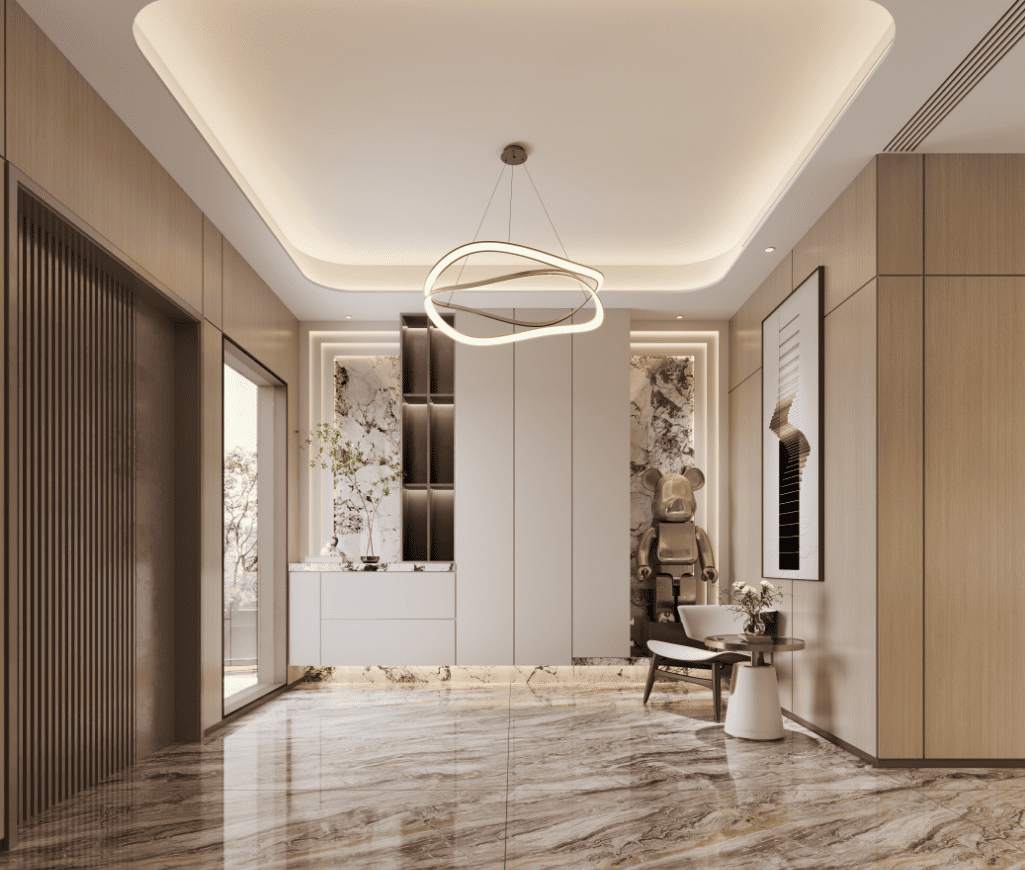 玄关设计注重归家仪式感,以天然石材地面搭配木质格栅屏风,既遮挡视线又引导动线;茶室或书房临窗布置,可品茗观鹭、执笔听风,成为精神休憩的“心灵岛屿”。