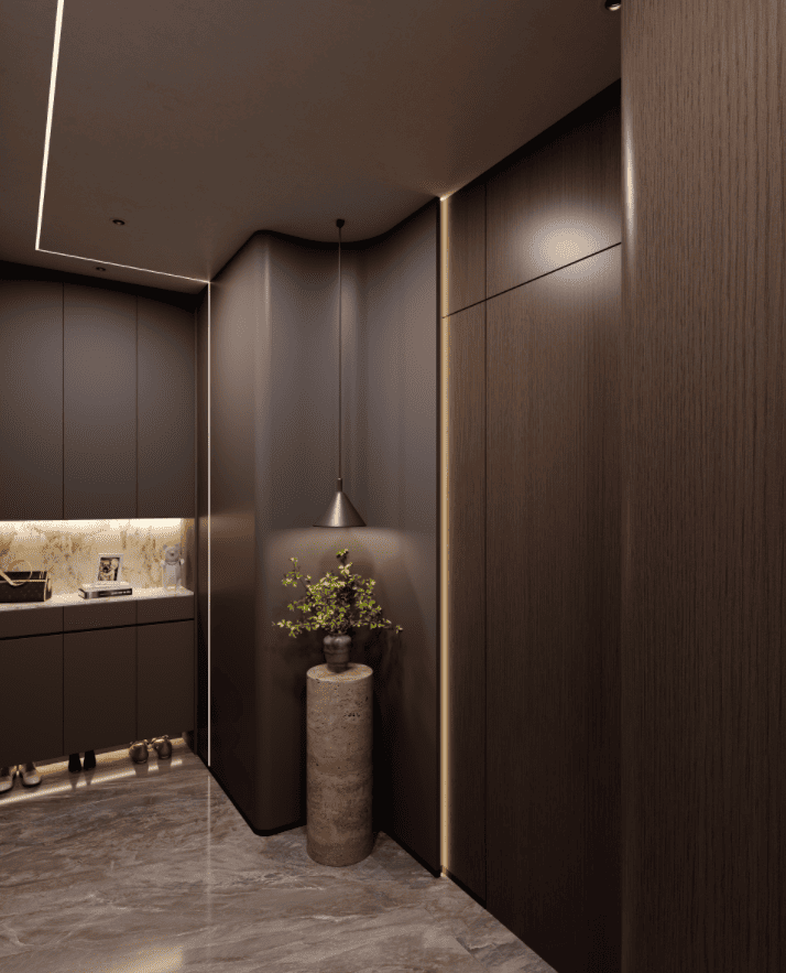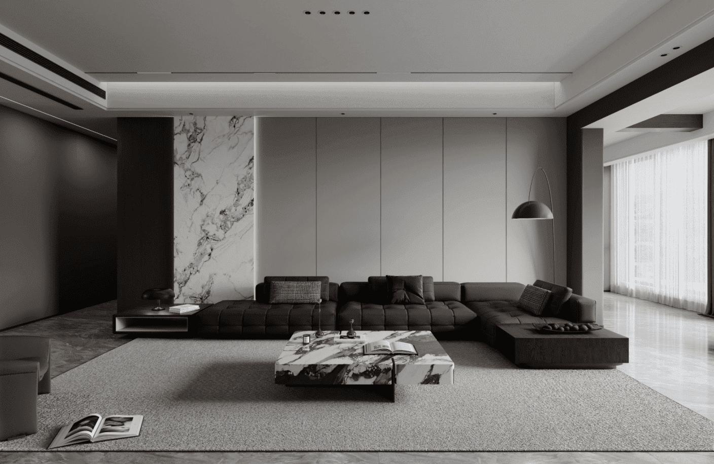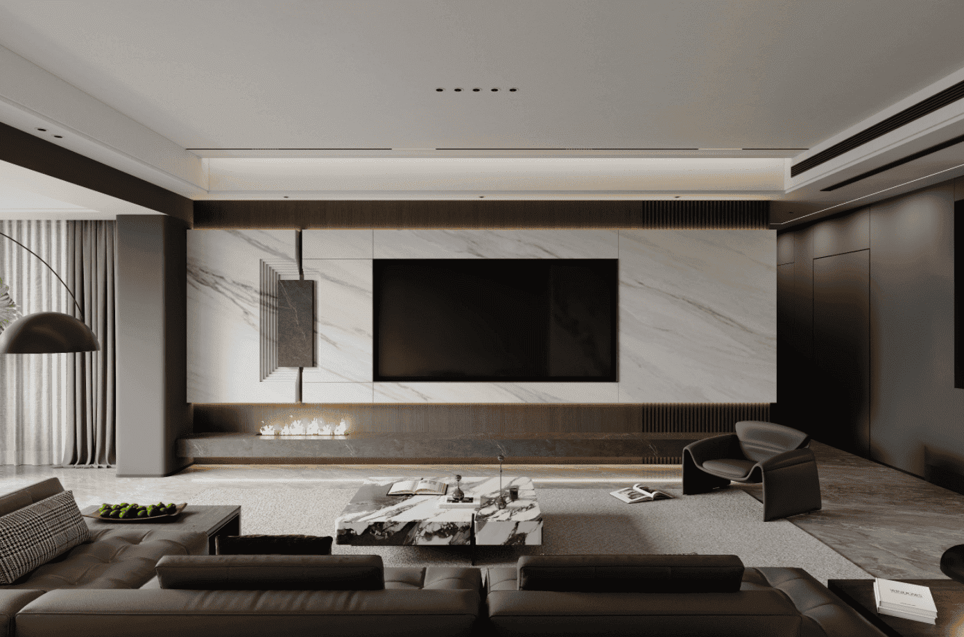 富力首府大宅的设计风格定位于“现代东方隐奢风”——摒弃繁复装饰与炫耀性材质,强调空间的秩序感、材质的天然肌理与光影的诗意流动。整体色调以高级灰、暖白、深咖、墨玉绿等低饱和色系为主,辅以胡桃木、哑光金属、天然石材与丝绒织物,营造出沉稳内敛却细节考究的氛围。奢华不在于金碧辉煌,而在于触手可及的质感、恰到好处的比例与无声流淌的气韵。