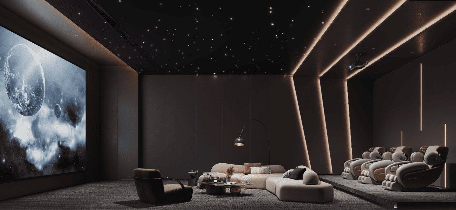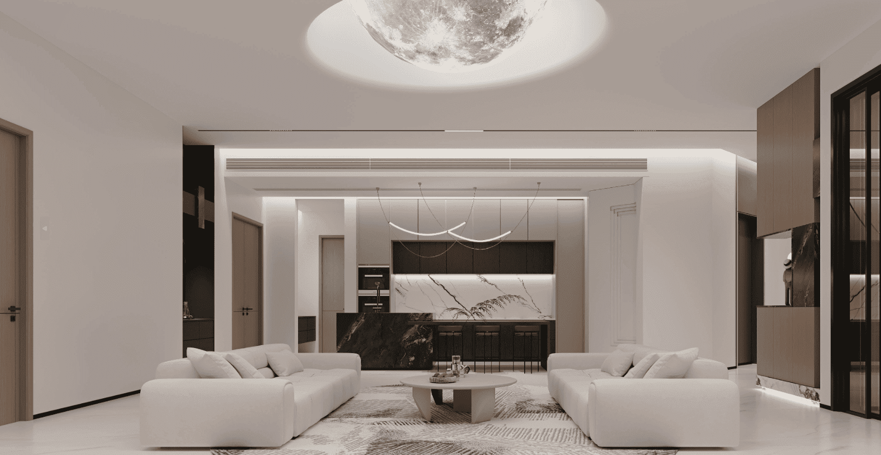 再者,光影的运用是赋予空间灵魂的重要手段。大宅设计中,照明不应仅满足基础功能,更应成为塑造氛围的艺术媒介。图中天花板中央悬挂的“月球”造型灯饰,不仅是视觉焦点,更象征着对宇宙与自然的敬畏,为室内注入诗意与浪漫。此外,隐藏式灯带、嵌入式射灯以及可调节的吊灯系统,共同构建出多层级的照明体系,可根据不同场景(如会客、阅读、休憩)灵活切换,实现“光随人动”的智能体验。