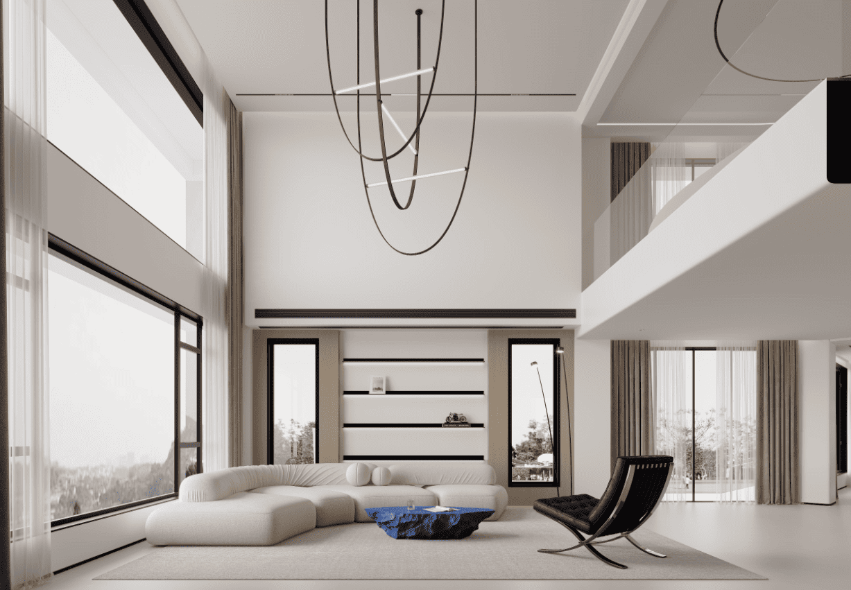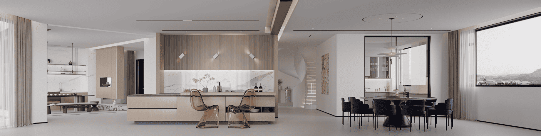 首先,空间格局的开放与流动是大宅设计的核心理念之一。现代大宅往往采用开放式布局,打破传统功能区之间的界限,使客厅、餐厅、厨房形成一体化的空间动线。如图中所示,客厅与厨房之间通过吧台自然过渡,既保持了区域独立性,又增强了互动感。这种设计不仅提升了空间的通透性,也便于家庭成员之间的交流与情感联结。同时,高挑的天花板与大面积落地窗引入充足自然光,营造出明亮、开阔的视觉感受,让居住者在物理空间上获得自由呼吸的体验。